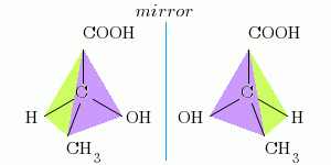 set_scale($scale = 10, $org_x_percent = 25, $org_y_percent = 50); $o_pos = O_POS_MIDDLE_LEFT; $cx = 0; $cy = -1; $mrad = 1; $nrad = 4; $prad = 4.5; $degs = array(90, 210, -30, 250); $m = array(); $n = array(); $p = array(); foreach($degs as $deg){ $m[] = array('x' => $cx + $mrad * cos(deg2rad($deg)), 'y' => $cy + $mrad * sin(deg2rad($deg))); $n[] = array('x' => $cx + $nrad * cos(deg2rad($deg)), 'y' => $cy + $nrad * sin(deg2rad($deg))); $p[] = array('x' => $cx + $prad * cos(deg2rad($deg)), 'y' => $cy + $prad * sin(deg2rad($deg))); } allocate_color($color = '#CCFF66'); fill_triangle($n[0]['x'], $n[0]['y'], $n[1]['x'], $n[1]['y'], $n[3]['x'], $n[3]['y']); allocate_color($color = '#CC99FF'); fill_triangle($n[0]['x'], $n[0]['y'], $n[3]['x'], $n[3]['y'], $n[2]['x'], $n[2]['y']); allocate_color($color = 'black'); draw_line($m[0]['x'], $m[0]['y'], $n[0]['x'], $n[0]['y']); draw_line($m[1]['x'], $m[1]['y'], $n[1]['x'], $n[1]['y']); draw_line($m[2]['x'], $m[2]['y'], $n[2]['x'], $n[2]['y']); draw_line($m[3]['x'], $m[3]['y'], $n[3]['x'], $n[3]['y']); $size = 12; draw_formula('$ C', $size, $cx, $cy, O_POS_MIDDLE_CENTER); draw_formula('$ COOH', $size, $p[0]['x'], $p[0]['y'], O_POS_LOW_LEFT); draw_formula('$ H', $size, $p[1]['x'], $p[1]['y'], O_POS_MIDDLE_RIGHT); draw_formula('$ OH', $size, $p[2]['x'], $p[2]['y'], O_POS_MIDDLE_LEFT); draw_formula('$ CH_3', $size, $p[3]['x'], $p[3]['y'], O_POS_UP_LEFT); set_scale($scale = 10, $org_x_percent = 75, $org_y_percent = 50); $o_pos = O_POS_MIDDLE_LEFT; $cx = 0; $cy = -1; $mrad = 1; $nrad = 4; $prad = 4.5; $degs = array(90, -30, 210, -70); $m = array(); $n = array(); $p = array(); foreach($degs as $deg){ $m[] = array('x' => $cx + $mrad * cos(deg2rad($deg)), 'y' => $cy + $mrad * sin(deg2rad($deg))); $n[] = array('x' => $cx + $nrad * cos(deg2rad($deg)), 'y' => $cy + $nrad * sin(deg2rad($deg))); $p[] = array('x' => $cx + $prad * cos(deg2rad($deg)), 'y' => $cy + $prad * sin(deg2rad($deg))); } allocate_color($color = '#CCFF66'); fill_triangle($n[0]['x'], $n[0]['y'], $n[1]['x'], $n[1]['y'], $n[3]['x'], $n[3]['y']); allocate_color($color = '#CC99FF'); fill_triangle($n[0]['x'], $n[0]['y'], $n[3]['x'], $n[3]['y'], $n[2]['x'], $n[2]['y']); allocate_color($color = 'black'); draw_line($m[0]['x'], $m[0]['y'], $n[0]['x'], $n[0]['y']); draw_line($m[1]['x'], $m[1]['y'], $n[1]['x'], $n[1]['y']); draw_line($m[2]['x'], $m[2]['y'], $n[2]['x'], $n[2]['y']); draw_line($m[3]['x'], $m[3]['y'], $n[3]['x'], $n[3]['y']); $size = 12; draw_formula('$ C', $size, $cx, $cy, O_POS_MIDDLE_CENTER); draw_formula('$ COOH', $size, $p[0]['x'], $p[0]['y'], O_POS_LOW_LEFT); draw_formula('$ H', $size, $p[1]['x'], $p[1]['y'], O_POS_MIDDLE_LEFT); draw_formula('$ OH', $size, $p[2]['x'], $p[2]['y'], O_POS_MIDDLE_RIGHT); draw_formula('$ CH_3', $size, $p[3]['x'], $p[3]['y'], O_POS_UP_LEFT); allocate_color($color = '#0099FF'); draw_line(-7.5, -7, -7.5, 5.5); allocate_color($color = '#0000FF'); draw_formula('mirror', $size, -7.5, 5.5, O_POS_LOW_CENTER);