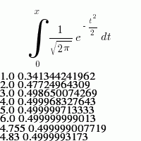 set_scale($scale = 10, $org_x_percent = 50, $org_y_percent = 50); function get_normal_distribution($x, $dx = 0.005) { $step = round($x / $dx); $dx = $x / $step; $v = 0; for($i = 0; $i < $step; ++$i){ $sx = $i * $dx; $ex = ($i + 1) * $dx; $v += ((exp(-1 * $sx * $sx * 0.5) / sqrt(2 * M_PI) + exp(-1 * $ex * $ex * 0.5) / sqrt(2 * M_PI)) * $dx * 0.5); } return $v; } function get_normal_distribution_stop(&$x, $stop = 0.499999, $dx = 0.005) { $step = round(10 / $dx); $v = 0; for($i = 0; $i < $step; ++$i){ $sx = $i * $dx; $ex = ($i + 1) * $dx; $v += ((exp(-1 * $sx * $sx * 0.5) / sqrt(2 * M_PI) + exp(-1 * $ex * $ex * 0.5) / sqrt(2 * M_PI)) * $dx * 0.5); if($v >= $stop){ $x = $ex; break; } } return $v; } $nd1 = "1.0 ".get_normal_distribution(1.0); $nd2 = "2.0 ".get_normal_distribution(2.0); $nd3 = "3.0 ".get_normal_distribution(3.0); $nd4 = "4.0 ".get_normal_distribution(4.0); $nd5 = "5.0 ".get_normal_distribution(5.0); $nd6 = "6.0 ".get_normal_distribution(6.0); draw_text($nd1, $x = -10, $y = 0, $o_pos = O_POS_UP_LEFT, $italic = false); draw_text($nd2, $x = -10, $y = -1.2, $o_pos = O_POS_UP_LEFT, $italic = false); draw_text($nd3, $x = -10, $y = -2.4, $o_pos = O_POS_UP_LEFT, $italic = false); draw_text($nd4, $x = -10, $y = -3.6, $o_pos = O_POS_UP_LEFT, $italic = false); draw_text($nd5, $x = -10, $y = -4.8, $o_pos = O_POS_UP_LEFT, $italic = false); draw_text($nd6, $x = -10, $y = -6.0, $o_pos = O_POS_UP_LEFT, $italic = false); $v = get_normal_distribution_stop($x, 0.499999); $ndx = $x." ".$v; draw_text($ndx, $x = -10, $y = -7.4, $o_pos = O_POS_UP_LEFT, $italic = false); $v = get_normal_distribution_stop($x, 0.4999993); $ndx = $x." ".$v; draw_text($ndx, $x = -10, $y = -8.6, $o_pos = O_POS_UP_LEFT, $italic = false); draw_formula($formula_text = "int{0}{x}{1 / sqrt{2 pi} {e ^ {- {t^2} / 2}} dt}", $size = 12, 0, 0, O_POS_LOW_CENTER);