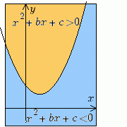set_scale($scale = 10, $org_x_percent = 20, $org_y_percent = 15); draw_rect($x1 = -2.9, $y1 = -2.5, $x2 = 10, $y2 = 14.8); set_antialias($antialias = false); df2_ax_p2_q($a = 0.3, $p = 2, $q = 2); set_antialias($antialias = true); allocate_color('#99CCFF'); fill_toborder(0, 0, $border_color_x = $x1, $border_color_y = $y1); allocate_color('#FFCC66'); fill_toborder(0, 8, $border_color_x = $x1, $border_color_y = $y1); allocate_color('black'); draw_xaxis($x_is_low_pos = false, $sx = -2.9, $ex = 10); draw_yaxis($y_is_right_pos = true, $sy = -2, $ey = 14.8); draw_formula('x^2+bx+c > 0', $size = 12, $px = -1.9, $py = 11, $o_pos = O_POS_LOW_LEFT); draw_formula('x^2+bx+c < 0', $size = 12, $px = 0, $py = 0, $o_pos = O_POS_UP_LEFT);