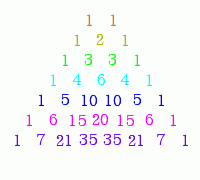 function fact($i) { $i = floor(abs($i)); if($i == 0){ $ret = 1; }else{ $ret = $i * fact($i - 1); } return $ret; } set_scale($scale = 20, $org_x_percent = 0, $org_y_percent = 0); $rainbow = array("#FF0000", "#FF6600", "#B0B000", "#00FF00", "#00FFFF", "#0000FF", "#FF00FF", "#6600FF", "#990066"); $r = 0.2; $cx = 5; $cy = 9; $dx = 1.2; $dy = -1; for($i = 1; $i < 8; ++$i){ allocate_color($rainbow[fmod($i, count($rainbow))]); allocate_text_color($rainbow[fmod($i, count($rainbow))]); $ax = $cx - ($dx * $i) / 2; $ay = $cy + $dy * $i; for($j = 0; $j < $i + 1; ++$j){ $bx = $ax + $j * $dx; $by = $ay; //fill_circle($bx, $by, $r); $k = fact($i) / (fact($j) * fact($i - $j)); draw_text($k, $bx, $by, O_POS_MIDDLE_CENTER, $italic = false); } }
