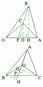 set_scale($scale = 10, $org_x_percent = 0, $org_y_percent = 50); $ox = 2; $oy = 2; $ax = 13; $ay = $oy; $bx = 10; $by = 13; $cx = 8; $cy = 7; calc_intersec_pt_of_lns($ox, $oy, $ax, $ay, $bx, $by, $cx, $cy, $px, $py); calc_foot_of_perpendicular_line($hx, $hy, $bx, $by, $ox, $oy, $ax - $ox, $ay - $oy); calc_foot_of_perpendicular_line($gx, $gy, $cx, $cy, $ox, $oy, $ax - $ox, $ay - $oy); allocate_color('green'); draw_line($px, $py, $ox, $oy); draw_line($px, $py, $ax, $ay); allocate_color('black'); draw_line($ox, $oy, $ax, $ay); draw_line($ax, $ay, $bx, $by); draw_line($bx, $by, $ox, $oy); draw_line($ax, $ay, $cx, $cy); draw_line($cx, $cy, $ox, $oy); allocate_color('green'); draw_line($bx, $by, $px, $py); draw_dash_line($bx, $by, $hx, $hy); draw_dash_line($cx, $cy, $gx, $gy); draw_line($px, $py, $hx, $hy); draw_line($px, $py, $gx, $gy); draw_corner_mark($hx, $hy, $bx, $by, $px, $py, $type = 1, $text = '', $italic = true, $text_ops = '', $italic_ops = false, $r = 10); draw_corner_mark($gx, $gy, $cx, $cy, $px, $py, $type = 1, $text = '', $italic = true, $text_ops = '', $italic_ops = false, $r = 10); allocate_color('black'); set_text_size($text_size = 12); allocate_text_color('black'); set_text_margin($text_margin = 3); draw_text('O', $ox, $oy, $o_pos = O_POS_UP_RIGHT); draw_text('A', $ax, $ay, $o_pos = O_POS_UP_LEFT); draw_text('B', $bx, $by, $o_pos = O_POS_LOW_RIGHT); draw_text('C', $cx, $cy, $o_pos = O_POS_LOW_RIGHT); draw_text('P', $px, $py, $o_pos = O_POS_UP_CENTER); draw_text('H', $hx, $hy, $o_pos = O_POS_UP_CENTER); draw_text('G', $gx, $gy, $o_pos = O_POS_UP_CENTER); set_scale($scale = 10, $org_x_percent = 0, $org_y_percent = 0); $ox = 7.5; $oy = 7.5; $ax = 9.5; $ay = 13; $bx = 2; $by = 4; $cx = 13; $cy = $by; calc_intersec_pt_of_lns($ox, $oy, $ax, $ay, $bx, $by, $cx, $cy, $px, $py); calc_foot_of_perpendicular_line($hx, $hy, $bx, $by, $ox, $oy, $ax - $ox, $ay - $oy); calc_foot_of_perpendicular_line($gx, $gy, $cx, $cy, $ox, $oy, $ax - $ox, $ay - $oy); allocate_color('green'); draw_line($px, $py, $ox, $oy); draw_line($px, $py, $ax, $ay); allocate_color('black'); draw_line($ox, $oy, $ax, $ay); draw_line($ax, $ay, $bx, $by); draw_line($bx, $by, $ox, $oy); draw_line($ax, $ay, $cx, $cy); draw_line($cx, $cy, $ox, $oy); allocate_color('green'); draw_line($bx, $by, $px, $py); draw_line($cx, $cy, $px, $py); draw_dash_line($bx, $by, $hx, $hy); draw_dash_line($cx, $cy, $gx, $gy); draw_line($px, $py, $hx, $hy); draw_line($px, $py, $gx, $gy); draw_corner_mark($hx, $hy, $px, $py, $bx, $by, $type = 1, $text = '', $italic = true, $text_ops = '', $italic_ops = false, $r = 10); draw_corner_mark($gx, $gy, $px, $py, $cx, $cy, $type = 1, $text = '', $italic = true, $text_ops = '', $italic_ops = false, $r = 10); allocate_color('black'); set_text_size($text_size = 12); allocate_text_color('black'); set_text_margin($text_margin = 3); draw_text('O', $ox, $oy, $o_pos = O_POS_MIDDLE_LEFT); draw_text('A', $ax, $ay, $o_pos = O_POS_LOW_LEFT); draw_text('B', $bx, $by, $o_pos = O_POS_UP_RIGHT); draw_text('C', $cx, $cy, $o_pos = O_POS_UP_LEFT); draw_text('P', $px, $py, $o_pos = O_POS_LOW_RIGHT); draw_text('H', $hx, $hy, $o_pos = O_POS_UP_LEFT); draw_text('G', $gx, $gy, $o_pos = O_POS_MIDDLE_RIGHT);