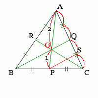 set_scale($scale = 20, $org_x_percent = 0, $org_y_percent = 0); $cent_x = 5; $cent_y = 5; $rad = 4; $ax = $cent_x + $rad * cos(deg2rad(80)); $ay = $cent_y + $rad * sin(deg2rad(80)); $bx = $cent_x + $rad * cos(deg2rad(180+30)); $by = $cent_y + $rad * sin(deg2rad(180+30)); $cx = $cent_x + $rad * cos(deg2rad(360-30)); $cy = $cent_y + $rad * sin(deg2rad(360-30)); $px = ($bx + $cx) / 2; $py = ($by + $cy) / 2; $qx = ($cx + $ax) / 2; $qy = ($cy + $ay) / 2; $q2x = (3 * $cx + $ax) / 4; $q2y = (3 * $cy + $ay) / 4; $q3x = ($cx + 3 * $ax) / 4; $q3y = ($cy + 3 * $ay) / 4; $rx = ($ax + $bx) / 2; $ry = ($ay + $by) / 2; $gx = ($ax + 2 * $px) / 3; $gy = ($ay + 2 * $py) / 3; draw_line($ax, $ay, $bx, $by); draw_line($bx, $by, $cx, $cy); draw_line($cx, $cy, $ax, $ay); allocate_color('green'); draw_line($px, $py, $ax, $ay); draw_line($qx, $qy, $bx, $by); draw_line($rx, $ry, $cx, $cy); draw_mark_on_line($ax, $ay, $bx, $by, MARK_1_LINE, $pos = 0.25); draw_mark_on_line($bx, $by, $cx, $cy, MARK_2_LINE, $pos = 0.25); draw_mark_on_line($cx, $cy, $ax, $ay, MARK_3_LINE, $pos = 0.25); draw_mark_on_line($ax, $ay, $bx, $by, MARK_1_LINE, $pos = 0.75); draw_mark_on_line($bx, $by, $cx, $cy, MARK_2_LINE, $pos = 0.75); draw_mark_on_line($cx, $cy, $ax, $ay, MARK_3_LINE, $pos = 0.75); allocate_color('red'); draw_line($px, $py, $q2x, $q2y); draw_arc_mark($tx, $ty, $cx, $cy, $q2x, $q2y, $text = '', $italic = true, ARC_TYPE_SOLID, $width_rate = 0.7, $text_hole_rate = 0); draw_arc_mark($tx, $ty, $q2x, $q2y, $qx, $qy, $text = '', $italic = true, ARC_TYPE_SOLID, $width_rate = 0.7, $text_hole_rate = 0); draw_arc_mark($tx, $ty, $qx, $qy, $q3x, $q3y, $text = '', $italic = true, ARC_TYPE_SOLID, $width_rate = 0.7, $text_hole_rate = 0); draw_arc_mark($tx, $ty, $q3x, $q3y, $ax, $ay, $text = '', $italic = true, ARC_TYPE_SOLID, $width_rate = 0.7, $text_hole_rate = 0); draw_arc_mark($tx, $ty, $ax, $ay, $gx, $gy, $text = '2', $italic = true, ARC_TYPE_SOLID, $width_rate = 0.7, $text_hole_rate = 1.2); draw_arc_mark($tx, $ty, $gx, $gy, $px, $py, $text = '1', $italic = true, ARC_TYPE_SOLID, $width_rate = 0.7, $text_hole_rate = 1.2); allocate_color('black'); set_text_size($text_size = 12); allocate_text_color('black'); set_text_margin($text_margin = 3); draw_text('A', $ax, $ay, $o_pos = O_POS_LOW_LEFT); draw_text('B', $bx, $by, $o_pos = O_POS_UP_RIGHT); draw_text('C', $cx, $cy, $o_pos = O_POS_UP_LEFT); draw_text('D', $dx, $dy, $o_pos = O_POS_UP_RIGHT); draw_text('P', $px, $py, $o_pos = O_POS_UP_LEFT); draw_text('Q', $qx, $qy, $o_pos = O_POS_LOW_LEFT); draw_text('R', $rx, $ry, $o_pos = O_POS_LOW_RIGHT); draw_text('S', $q2x, $q2y, $o_pos = O_POS_LOW_LEFT); allocate_text_color('red'); draw_text('G', $gx, $gy, $o_pos = O_POS_LOW_RIGHT);