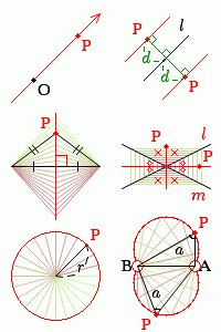 set_scale($scale = 10, $org_x_percent = 0, $org_y_percent = 66); $sx = 1; $sy = 1; $ex = 9; $ey = 9; $ox = 3; $oy = 3; $px = 7; $py = 7; allocate_color('red'); draw_line($sx, $sy, $ex, $ey); draw_arrow_head($sx, $sy, $ex, $ey, $pos = 1.0, $count = 1); draw_mark($px, $py, $angle = 0, MARK_DOT); allocate_color('black'); draw_mark($ox, $oy, $angle = 0, MARK_DOT); set_text_margin($text_margin = 4); draw_text('O', $ox, $oy, $o_pos = O_POS_UP_LEFT, $italic = false); allocate_text_color('red'); draw_text('P', $px, $py, $o_pos = O_POS_UP_LEFT, $italic = false); set_scale($scale = 10, $org_x_percent = 50, $org_y_percent = 66); $sx = 3; $sy = 3; $ex = 7; $ey = 7; $ox = 5; $oy = 5; $vx = -1.7; $vy = $vx * -1; $s2x = $sx + $vx; $s2y = $sy + $vy; $e2x = $ex + $vx; $e2y = $ey + $vy; $o2x = $ox + $vx; $o2y = $oy + $vy; $s3x = $sx - $vx; $s3y = $sy - $vy; $e3x = $ex - $vx; $e3y = $ey - $vy; $o3x = $ox - $vx; $o3y = $oy - $vy; allocate_color('red'); draw_line($s2x, $s2y, $e2x, $e2y); draw_line($s3x, $s3y, $e3x, $e3y); draw_mark($o2x, $o2y, $angle = 0, MARK_DOT); draw_mark($o3x, $o3y, $angle = 0, MARK_DOT); allocate_color('green'); allocate_text_color('green'); draw_line($o2x, $o2y, $o3x, $o3y); draw_arc_mark($tx, $ty, $o2x, $o2y, $ox, $oy, $text = 'd', $italic = true, $arc_end_type = ARC_TYPE_DASH, $width_rate = 1, $text_hole_rate = 1.2); draw_arc_mark($tx, $ty, $ox, $oy, $o3x, $o3y, $text = 'd', $italic = true, $arc_end_type = ARC_TYPE_DASH, $width_rate = 1, $text_hole_rate = 1.2); draw_corner_mark($o2x, $o2y, $ox, $oy, $e2x, $e2y, $type = 1, $text = '', $italic = true, $text_ops = '', $italic_ops = false, $r = 6); draw_corner_mark($ox, $oy, $ex, $ey, $o2x, $o2y, $type = 1, $text = '', $italic = true, $text_ops = '', $italic_ops = false, $r = 6); draw_corner_mark($o3x, $o3y, $e3x, $e3y, $o2x, $o2y, $type = 1, $text = '', $italic = true, $text_ops = '', $italic_ops = false, $r = 6); allocate_color('black'); draw_line($sx, $sy, $ex, $ey); set_text_margin($text_margin = 4); allocate_text_color('black'); draw_text('l', $ex, $ey, $o_pos = O_POS_LOW_RIGHT, $italic = true); allocate_text_color('red'); draw_text('P', $o2x, $o2y, $o_pos = O_POS_LOW_RIGHT, $italic = false); draw_text('P', $o3x, $o3y, $o_pos = O_POS_UP_LEFT, $italic = false); set_scale($scale = 10, $org_x_percent = 25, $org_y_percent = 50); $ax = -4; $ay = 0; $bx = 4; $by = 0; $px = 0; $py = 3; for($i = 4.5; $i >= -4.5; $i -= 0.5){ $green = sprintf("%02x", floor(127 * ($i + 4.5) / 9) + 128); allocate_color('#cc'.$green.'99'); draw_line($ax, $ay, 0, $i); draw_line($bx, $by, 0, $i); } allocate_color('black'); draw_line($ax, $ay, $bx, $by); draw_line($ax, $ay, $px, $py); draw_line($bx, $by, $px, $py); draw_mark_on_line($ax, $ay, $bx, $by, MARK_1_LINE, $pos = 0.25); draw_mark_on_line($ax, $ay, $bx, $by, MARK_1_LINE, $pos = 0.75); draw_mark_on_line($ax, $ay, $px, $py, MARK_2_LINE, $pos = 0.5); draw_mark_on_line($bx, $by, $px, $py, MARK_2_LINE, $pos = 0.5); allocate_color('red'); draw_line($px, 4.8, $px, -4.8); draw_mark($px, $py, $angle = 0, MARK_DOT); draw_corner_mark(0, 0, $bx, $by, $px, $py, $type = 1, $text = '', $italic = true, $text_ops = '', $italic_ops = false, $r = 10); allocate_text_color('red'); draw_text('P', $px, $py, $o_pos = O_POS_LOW_RIGHT, $italic = false); set_scale($scale = 10, $org_x_percent = 75, $org_y_percent = 50); $ax = -4; $ay = -2; $bx = 4; $by = 2; $a2x = -4; $a2y = 2; $b2x = 4; $b2y = -2; $px = 0; $py = 1.8; $p2x = 3; $p2y = 0; for($i = 0.1; $i <= 0.8; $i += 0.1){ $green = sprintf("%02x", floor(127 * $i + 128)); allocate_color('#cc'.$green.'99'); $tx = $i * $ax; $ty = $i * $ay; draw_line($tx, $ty, -1 * $tx, $ty); draw_line(-1 * $tx, $ty, -1 * $tx, -1 * $ty); draw_line(-1 * $tx, -1 * $ty, $tx, -1 * $ty); draw_line($tx, -1 * $ty, $tx, $ty); } allocate_color('black'); draw_line($ax, $ay, $bx, $by); draw_line($a2x, $a2y, $b2x, $b2y); allocate_color('red'); draw_line($ax, 0, $bx, 0); draw_line(0, $ay, 0, $by); draw_mark($px, $py, $angle = 0, MARK_DOT); draw_mark($p2x, $p2y, $angle = 0, MARK_DOT); set_mark_size($mark_size = 5); draw_corner_mark(0, 0, 1, 0, $bx, $by, MARK_CIRCLE, $text = '', $italic = true, $text_ops = '', $italic_ops = false, $r = 10); draw_corner_mark(0, 0, $bx, $by, 0, 1, MARK_CROSS, $text = '', $italic = true, $text_ops = '', $italic_ops = false, $r = 10); draw_corner_mark(0, 0, 0, 1, -1 * $bx, $by, MARK_CROSS, $text = '', $italic = true, $text_ops = '', $italic_ops = false, $r = 10); draw_corner_mark(0, 0, -1 * $bx, $by, -1, 0, MARK_CIRCLE, $text = '', $italic = true, $text_ops = '', $italic_ops = false, $r = 10); draw_corner_mark(0, 0, -1, 0, -1 * $bx, -1 * $by, MARK_CIRCLE, $text = '', $italic = true, $text_ops = '', $italic_ops = false, $r = 10); draw_corner_mark(0, 0, -1 * $bx, -1 * $by, 0, -1, MARK_CROSS, $text = '', $italic = true, $text_ops = '', $italic_ops = false, $r = 10); draw_corner_mark(0, 0, 0, -1, $bx, -1 * $by, MARK_CROSS, $text = '', $italic = true, $text_ops = '', $italic_ops = false, $r = 10); draw_corner_mark(0, 0, $bx, -1 * $by, 1, 0, MARK_CIRCLE, $text = '', $italic = true, $text_ops = '', $italic_ops = false, $r = 10); draw_text('l', $bx, $by, $o_pos = O_POS_LOW_RIGHT, $italic = true); draw_text('m', $b2x, $b2y, $o_pos = O_POS_UP_RIGHT, $italic = true); allocate_text_color('red'); draw_text('P', $px, $py, $o_pos = O_POS_LOW_RIGHT, $italic = false); draw_text('P', $p2x, $p2y, $o_pos = O_POS_LOW_LEFT, $italic = false); set_scale($scale = 10, $org_x_percent = 25, $org_y_percent = 17); $cx = 0; $cy = 0; $r = 4; $px = $r * cos(M_PI / 4); $py = $r * sin(M_PI / 4); for($i = 0; $i < 1; $i += (1/24)){ $green = sprintf("%02x", floor(127 * $i + 128)); allocate_color('#cc'.$green.'99'); $tx = $r * cos($i * 2 * M_PI); $ty = $r * sin($i * 2 * M_PI); draw_line($cx, $cy, $tx, $ty); } allocate_color('black'); allocate_text_color('black'); draw_line($cx, $cy, $px, $py); draw_arc_mark($tx, $ty, $cx, $cy, $px, $py, $text = 'r', $italic = true, $arc_end_type = ARC_TYPE_DASH, $width_rate = 1, $text_hole_rat