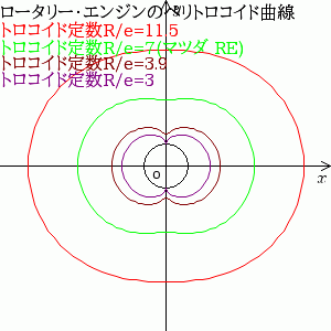 set_scale($scale = 10, $org_x_percent = 50, $org_y_percent = 50); draw_xyaxis(); $ang2_a = M_PI; $ang2_b = M_PI - 2 * M_PI * 2; $R_e_c_s = array( array(11.5, "#FF0000", ""), array(7.0, "#00FF00", "(マツダ RE)"), array(3.9, "#800000", ""), array(3.0, "#800080", "")); $c1x = 0; $c1y = 0; $rad1 = 2; draw_circle($c1x, $c1y, $rad1); $rad2 = $rad1 * 3 / 2; $e = $rad2 - $rad1; draw_text('ロータリー・エンジンのペリトロコイド曲線', $x -15, $y = 15, O_POS_UP_LEFT, $italic = false); foreach($R_e_c_s as $j => $R_e_c){ $R = $R_e_c[0] * $e; allocate_text_color($R_e_c[1]); draw_text('トロコイド定数R/e='.$R_e_c[0].$R_e_c[2], $x -15, $y = 15 - ($j + 1) * 1.5, O_POS_UP_LEFT, $italic = false); $div = 100; $c2xb = 0; $c2yb = 0; $sx = 0; $sy = 0; for($i = 0; $i <= $div; ++$i){ $ang2 = (($div - $i) * $ang2_a + $i * $ang2_b) / $div; //allocate_color('red'); //draw_mark($i * 10 / $div, $ang2, $angle = 0, MARK_DOT); $dang2 = $ang2 - $ang2_a;//- //allocate_color('#00FFFF');//Aqua //draw_mark($i * 10 / $div, $dang2, $angle = 0, MARK_DOT); $len2 = $dang2 * $rad2;//- //allocate_color('green'); //draw_mark($i * 10 / $div, $len2, $angle = 0, MARK_DOT); $dang1 = $len2 / $rad1;//- //allocate_color('blue'); //draw_mark($i * 10 / $div, $dang1, $angle = 0, MARK_DOT); $ang_p = M_PI + $dang1; //allocate_color('#800000');//Maroon //draw_mark($i * 10 / $div, $ang_p, $angle = 0, MARK_DOT); //$p1x = $rad1 * cos($ang_p) + $c1x; //$p1y = $rad1 * sin($ang_p) + $c1y; $ang_e = $ang_p - M_PI; //allocate_color('#008080');//Teal //draw_mark($i * 10 / $div, $ang_e, $angle = 0, MARK_DOT); $c2x = $e * cos($ang_e) + $c1x; $c2y = $e * sin($ang_e) + $c1y; $ang3 = $ang_p - $dang2 - M_PI; //allocate_color('#800080');//Purple //draw_mark($i * 10 / $div, $ang_e, $angle = 0, MARK_DOT); $tx = $R * cos($ang3) + $c2x; $ty = $R * sin($ang3) + $c2y; if($i > 0){ //draw_line($c2xb, $c2yb, $c2x, $c2y); allocate_color($R_e_c[1]); draw_line($sx, $sy, $tx, $ty); } $c2xb = $c2x; $c2yb = $c2y; $sx = $tx; $sy = $ty; } }