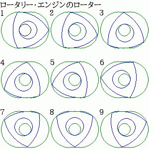 set_scale($scale = 10, $org_x_percent = 50, $org_y_percent = 50); //draw_xyaxis(); $ang2_a = M_PI; $ang2_b = M_PI - 2 * M_PI * 2; draw_text('ロータリー・エンジンのローター', $x -15, $y = 15, O_POS_UP_LEFT, $italic = false); //allocate_text_color("#008800"); //draw_text('トロコイド定数R/e=7(マツダ RE)', $x -15, $y = 15 - ($j + 1) * 1.5, O_POS_UP_LEFT, $italic = false); $rad1 = 2 * 0.6; $rad2 = $rad1 * 3 / 2; $e = $rad2 - $rad1; $R = 7.0 * $e; $TR = sqrt(3) * $R; for($pj = 0; $pj < 3; ++$pj){ for($pi = 0; $pi < 3; ++$pi){ $c1x = $pi * 10 - 10; $c1y = 10 - $pj * 10 - 1; draw_circle($c1x, $c1y, $rad1); draw_text(($pj * 3 + $pi) + 1, $c1x - 5, $c1y + 4, O_POS_UP_LEFT, $italic = false); $div = 100; $c2xb = 0; $c2yb = 0; $sx = 0; $sy = 0; for($i = 0; $i <= $div; ++$i){ $ang2 = (($div - $i) * $ang2_a + $i * $ang2_b) / $div; //allocate_color('red'); //draw_mark($i * 10 / $div, $ang2, $angle = 0, MARK_DOT); $dang2 = $ang2 - $ang2_a;//- //allocate_color('#00FFFF');//Aqua //draw_mark($i * 10 / $div, $dang2, $angle = 0, MARK_DOT); $len2 = $dang2 * $rad2;//- //allocate_color('green'); //draw_mark($i * 10 / $div, $len2, $angle = 0, MARK_DOT); $dang1 = $len2 / $rad1;//- //allocate_color('blue'); //draw_mark($i * 10 / $div, $dang1, $angle = 0, MARK_DOT); $ang_p = M_PI + $dang1; //allocate_color('#800000');//Maroon //draw_mark($i * 10 / $div, $ang_p, $angle = 0, MARK_DOT); //$p1x = $rad1 * cos($ang_p) + $c1x; //$p1y = $rad1 * sin($ang_p) + $c1y; $ang_e = $ang_p - M_PI; //allocate_color('#008080');//Teal //draw_mark($i * 10 / $div, $ang_e, $angle = 0, MARK_DOT); $c2x = $e * cos($ang_e) + $c1x; $c2y = $e * sin($ang_e) + $c1y; $ang3 = $ang_p - $dang2 - M_PI; //allocate_color('#800080');//Purple //draw_mark($i * 10 / $div, $ang_e, $angle = 0, MARK_DOT); $tx = $R * cos($ang3) + $c2x; $ty = $R * sin($ang3) + $c2y; if($i == floor(($pj * 3 + $pi) * 11 / 3)){ for($k = 0; $k < 3; ++$k){ $ang4 = $ang3 + $k * M_PI * 2 / 3; $apx = $R * cos($ang4) + $c2x; $apy = $R * sin($ang4) + $c2y; //allocate_color("red"); //draw_mark($apx, $apy, $angle = 0, MARK_DOT); allocate_color("#".sprintf("%02x", $i)."00FF"); draw_arc($apx, $apy, $TR, $ang4 + M_PI * 5 / 6, $ang4 + M_PI * 5 / 6 + M_PI / 3); draw_circle($c2x, $c2y, $rad2); } } if($i > 0){ //draw_line($c2xb, $c2yb, $c2x, $c2y); allocate_color("#008800"); draw_line($sx, $sy, $tx, $ty); } $c2xb = $c2x; $c2yb = $c2y; $sx = $tx; $sy = $ty; } } }