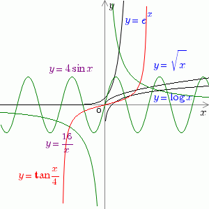 set_scale($scale = 10, $org_x_percent = 50, $org_y_percent = 50); allocate_color('gray'); draw_xyaxis(); allocate_color('black'); set_x_def_range($xds = 0, $xde = 15); df_y_fx(sqrt); allocate_text_color('blue'); draw_formula("y=sqrt{x}", $size = 12, $px = 7, $py = sqrt(7) + 2, $o_pos = O_POS_LOW_LEFT); set_x_def_range($xds = -15, $xde = 15); df_y_fx(exp); draw_formula("y=e^x", $size = 12, $px = 2.4+0.5, $py = exp(2.4), $o_pos = O_POS_LOW_LEFT); set_x_def_range($xds = 0, $xde = 15, $equal_xds = false, $equal_xde = true); df_y_fx(log); draw_formula("y=log x", $size = 12, $px = 7, $py = log(7), $o_pos = O_POS_UP_LEFT); allocate_color('green'); set_x_def_range($xds = -15, $xde = 0, $equal_xds = true, $equal_xde = false); function x_inv($x){return 16/$x;} df_y_fx(x_inv); set_x_def_range($xds = 0, $xde = 15, $equal_xds = false, $equal_xde = true); df_y_fx(x_inv); allocate_text_color('purple'); draw_formula("y=16/x", $size = 12, $px = -4, $py = -4, $o_pos = O_POS_UP_RIGHT); set_x_def_range($xds = -15, $xde = 15, $equal_xds = false, $equal_xde = false); function sin4($x){return 4*sin($x);} df_y_fx(sin4); draw_formula("y=4sin x", $size = 12, $px = M_PI * (-3/2), $py = 4, $o_pos = O_POS_LOW_CENTER); set_x_def_range($xds = -2 * M_PI, $xde = 2 * M_PI, $equal_xds = false, $equal_xde = false); function tan4($x){return tan($x/4);} allocate_color('red'); df_y_fx(tan4); allocate_text_color('red'); draw_formula("y=tan x/4", $size = 12, $px = -6, $py = -12, $o_pos = O_POS_LOW_RIGHT);
